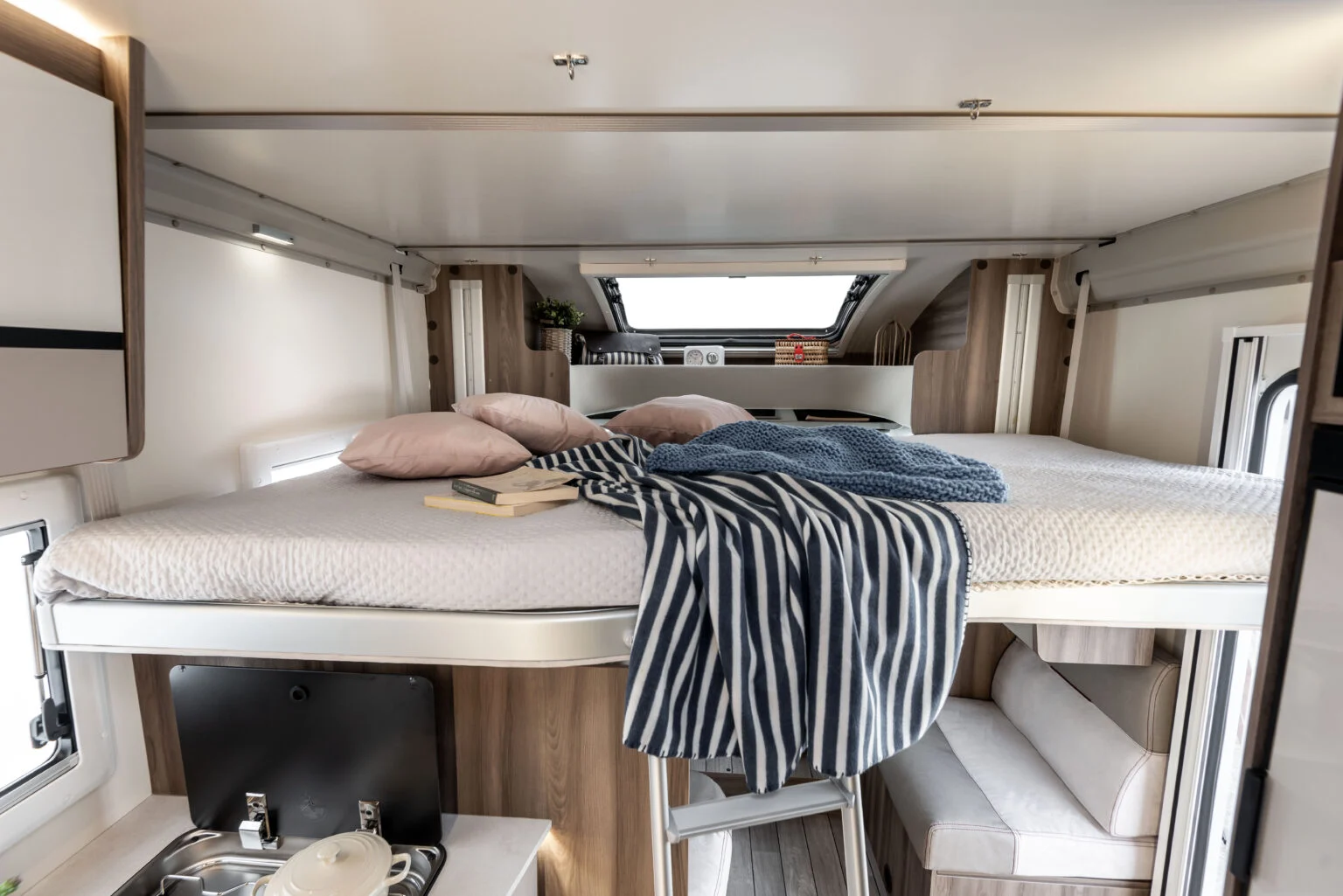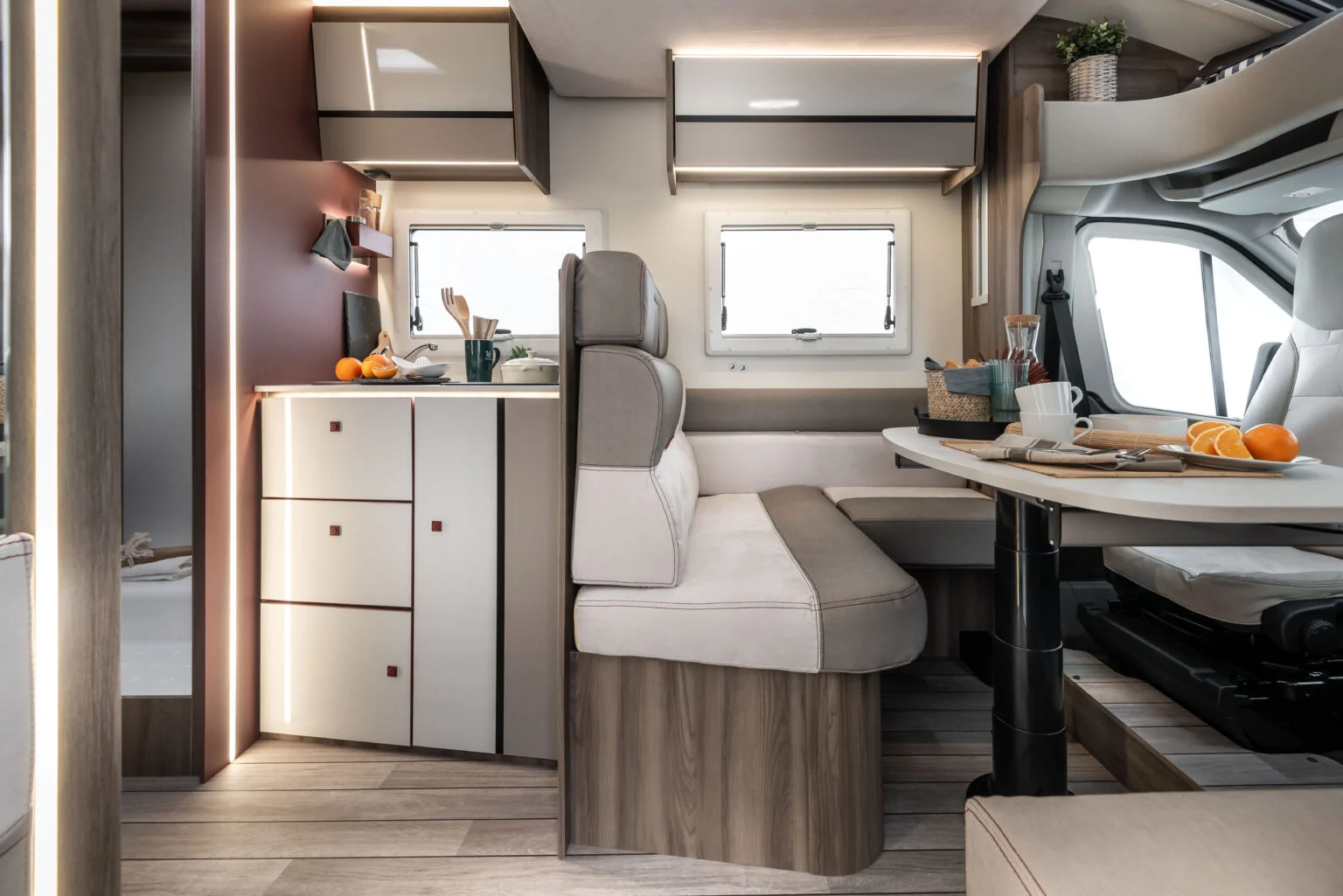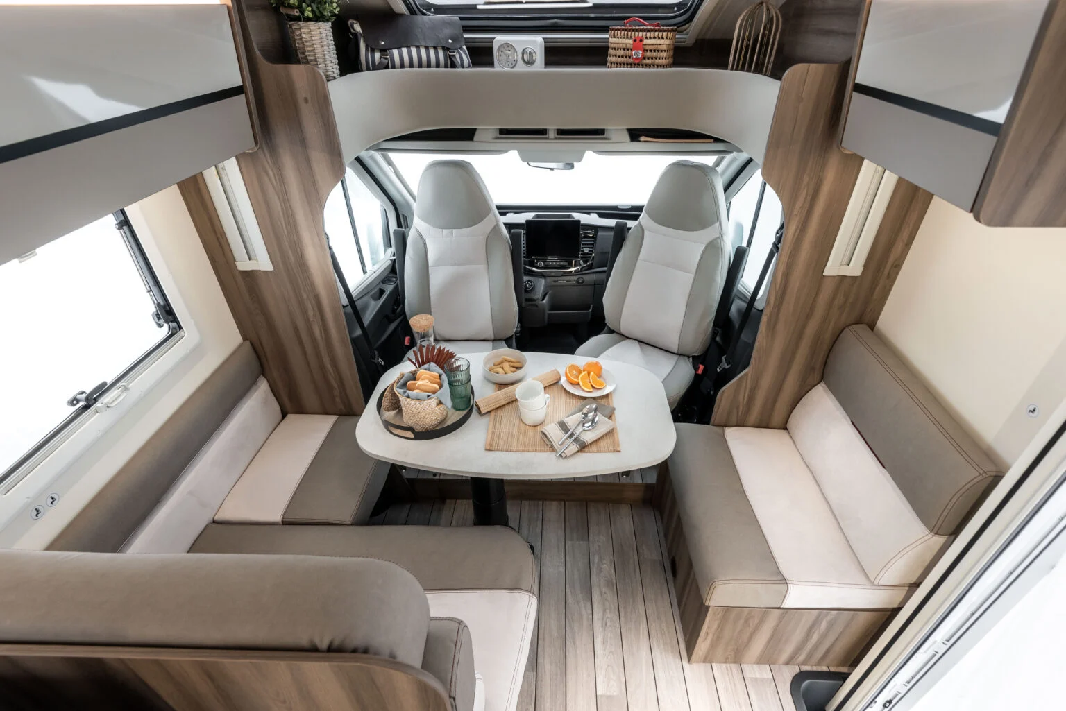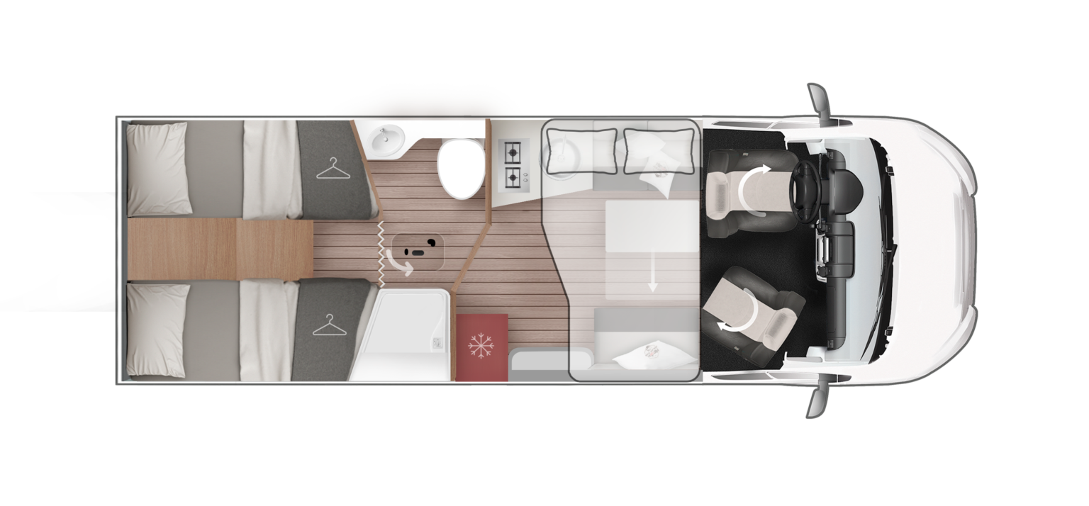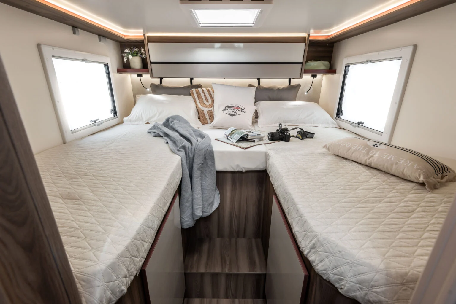 Roller Team Kronos 287TL to model dla osób, które szukają wygodnego i dobrze zorganizowanego wnętrza w układzie z dwoma łóżkami pojedynczymi z tyłu. Dzięki wyraźnemu podziałowi na strefę dzienną i nocną zapewnia większą prywatność i komfort codziennego użytkowania, szczególnie dla 2–4 osób. Dodatkowe łóżko opuszczane z przodu oraz duży garaż sprawiają, że kamper jest praktyczny zarówno na krótsze wyjazdy, jak i dłuższe użytkowanie.