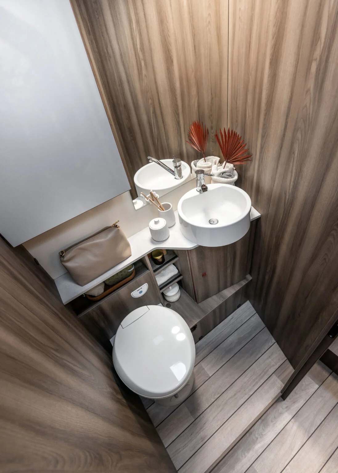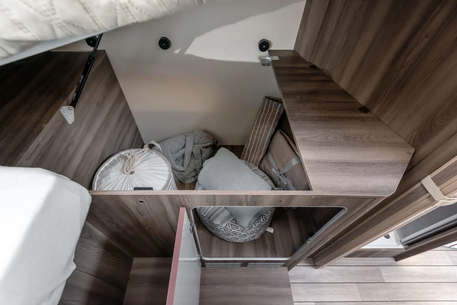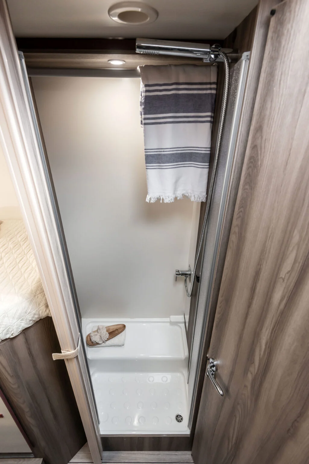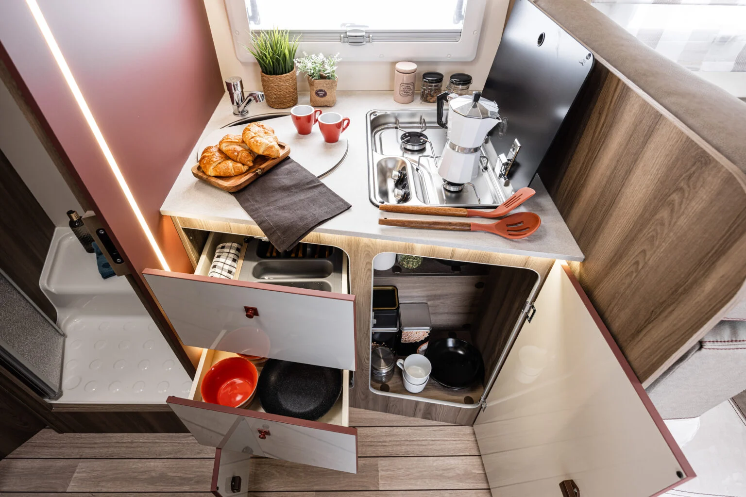 Roller Team Kronos 287TL to model dla osób, które szukają wygodnego i dobrze zorganizowanego wnętrza w układzie z dwoma łóżkami pojedynczymi z tyłu. Dzięki wyraźnemu podziałowi na strefę dzienną i nocną zapewnia większą prywatność i komfort codziennego użytkowania, szczególnie dla 2–4 osób. Dodatkowe łóżko opuszczane z przodu oraz duży garaż sprawiają, że kamper jest praktyczny zarówno na krótsze wyjazdy, jak i dłuższe użytkowanie.